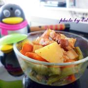 五花肉、土豆、豆角、胡萝卜、花生油、盐、草菇老抽、大料、葱、料酒、姜。