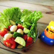 生菜、黄瓜、西红柿、鹌鹑蛋、香醋、味达美、盐、白糖、香油。