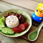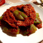 长条茄子、五花肉、生菜叶、黄瓜、红肠、葱花、蒜末、八角、花椒、茴香、蚝油、甜酱、盐、白糖、胡椒粉、老抽。
