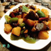 土豆、茄子、青椒、干辣椒、蒜末、葱段、姜片、淀粉、八角、生抽、醋、白糖、盐、料酒。