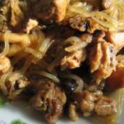 笨鸡、榛蘑、粉条、盐、糖、葱、姜、蒜、花椒、八角、料酒、酱油。