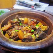 牛排骨、土豆、洋葱、葱、生姜、老酒、生抽、老抽、冰糖、黑胡椒粉、醋、蚝油。
