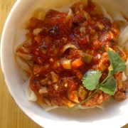 面条、猪肉丁、香菇丁、西红柿丁、青椒丁、香菜、葱、胡萝卜丁、食用盐、食用油、辣椒面、麻油、酱油、干淀粉、胡椒粉。