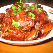 排骨、姜片、葱花、烤肉酱、糖、番茄沙司、醋、生抽、料酒。