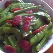 荷兰豆、腊肠、蒜片、盐、鸡精。