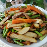 蒜薹、瘦猪肉、豆腐干、红萝卜、花生油、盐、生抽、料酒、味精。