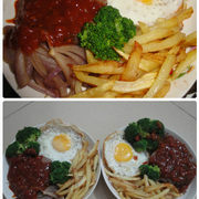 牛扒、洋葱、西兰花、薯仔、番茄、鸡蛋、茄汁、盐、胡椒粉。