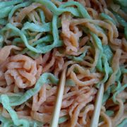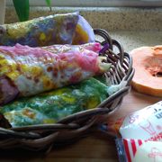 面粉、鸡蛋、土豆、菠菜、火龙果皮、紫甘蓝、胡萝卜、生菜、葱、香黄瓜、香菜、豆瓣酱、韩国辣酱、沙拉酱、千岛酱、盐、油。