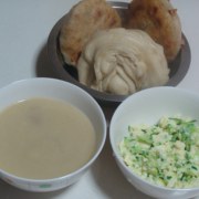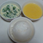 菠菜、鹌鹑蛋、细肠、盐、玉米渣、奶黄馒头。