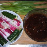 甜面酱、豆瓣酱、猪瘦肉、葱白、黄瓜、水萝卜、小葱、油。