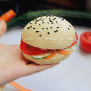 西红柿、黄瓜、胡萝卜、自制汉堡胚、奶酪、沙拉酱。