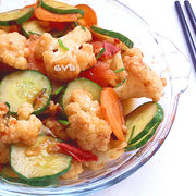 花菜、番茄、胡萝卜、黄瓜、韭菜、蒜末、盐、鸡精、水淀粉、食用油。