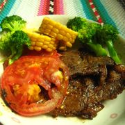牛排、酱油、白糖、蚝油、黑胡椒、五香粉、黄油、西兰花、玉米、西红柿。