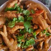 新鲜凤爪、豆瓣酱,火腿肠、葱,姜,蒜、食盐,醋,白糖、香菜,小葱。