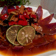 鲢鱼头、泡椒、泡姜、柠檬、洋葱、料酒、老抽、白糖。