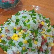 米饭、叉烧、玉米粒、蒜苔、小葱、油、盐、糖。