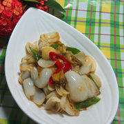 鲜鲍鱼、鲜百合、青椒、红椒、油、糖、盐、生抽、生粉。