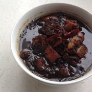 油豆腐,肉,黑木耳。香菇。胡萝、生姜,大蒜、酒,盐,蚝油。