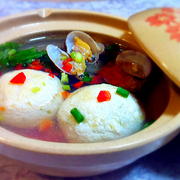 大豆腐、猪肉馅、虾仁、花蚬子、香菜、大葱、姜、鸡蛋清、干淀粉、色拉油、香油、酱油、味精、盐。