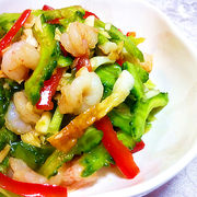 苦瓜、虾仁、鱼棒、大蒜、红椒。