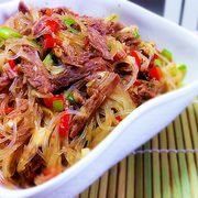 牛肉、粉丝、红椒、青椒、大蒜、牛肉汤、酱油、蚝油、辣椒粉、胡椒粉、盐、味素、香油、水淀粉。