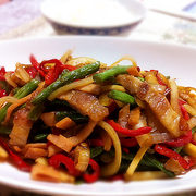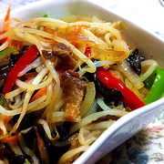 豆芽、黑木耳、小洋葱、粉条、五花肉、青椒、红椒。