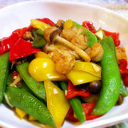 荷兰豆、鲜虾仁、红椒、黄椒、草蘑菇、蚝油、胡椒粉、盐、味精。
