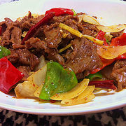 牛里脊、小洋葱、红椒青椒、姜、干淀粉、小苏打、蚝油、红油、胡椒粉、孜然粉、麻椒粉、辣椒粉、盐、味精。