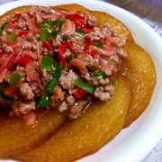 冬瓜、猪肉馅、虾米、红椒、青椒、蚝油、老抽、淀粉、香油。