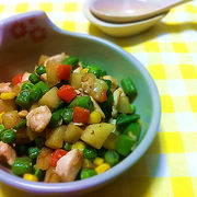 鸡胸脯、细芸豆、土豆、胡萝卜、熟玉米、豌豆、蚝油、盐、味精。