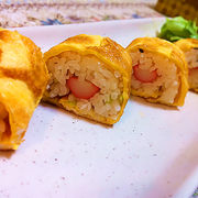 鸡蛋、剩米饭、蟹足棒、葱花、黑芝麻、盐、味精。
