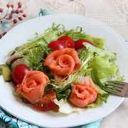 烟熏三文鱼、小黄瓜、小番茄、苦菊、圆生菜、白醋、寿司酱油、盐、橄榄油、白糖。