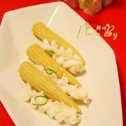 玉米笋罐头、鲜鱿鱼、蒜末、油、调味鸡汁、生粉、鸡粉、胡椒粉、砂糖、清水。