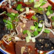 鸭血、火腿肠、黑木耳、金针茹、毛肚、黄豆芽、虾仁、葱末、姜末、蒜末、小干椒、花椒粒、八角、香叶。
