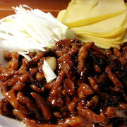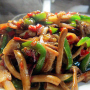 精瘦肉、葱丝、豆皮、蒜末、姜片、面酱、酱油、料酒、蚝油、盐、糖、淀粉。