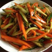 胡萝卜、黄瓜、盐、鸡精、生抽、醋、糖、香辣酱、香油。