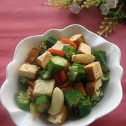 秋葵、豆干、蒜、红椒、油、盐、胡椒粉。