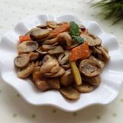 鸡腿、草菇、胡萝卜、生姜、蒜头、盐、油、姜粉、胡椒粉、料酒、生抽、淀粉。