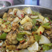 鸡、土豆、洋葱、螺丝辣椒、面、干辣椒、葱、姜、蒜、豆瓣酱、茴香、花椒粉、十三香、料酒、盐、糖。