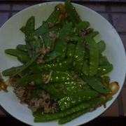 猪肉、料酒、盐、干香菇、蒜瓣、荷兰豆、油。