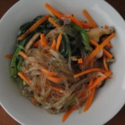 红薯粉、干香菇、菠菜、胡萝卜、红葱头、生抽、糖、芝麻油、蒜蓉、烤芝麻、椒盐。
