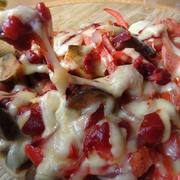 芝士、培根、茄子、西红柿、红椒、洋葱、番茄酱、盐、黑胡椒、橄榄油。