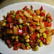 牛肉、青豆、玉米、土豆、胡萝卜、红椒、姜葱、盐、酱油、味精、小苏打。