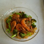 洋葱、西红柿、大虾、西兰花、酱油、胡椒粉。