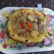 菠萝、白饭、胡萝卜、豌豆、鸡蛋、瘦肉、葱、盐、胡椒粉、酱油。
