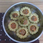苦瓜、瘦肉、胡萝卜、葱、盐、生抽、生粉、胡椒粉、玉米油。