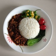 去皮五花肉、米饭、盐、糖、鸡精、橄榄油、老抽、蚝油、黄酒、淀粉。