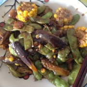 豆角、茄子、玉米、葱、姜、肥肉、大料、花椒面、生抽、清水、盐。