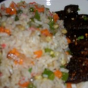 猪排、胡萝卜、青椒、玉米、洋葱、蟹黄棒、姜、料酒、葱、白糖、淀粉、老抽、花椒粉、辣椒粉、芝麻、盐、鸡精。
