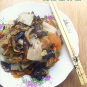 油面筋、香菇、水发黑木耳、白菜、胡萝卜、朝天椒辣椒酱、盐、鸡精。